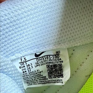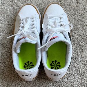 Nike sneakers with a crisp white base and tan details. Stylish and comfortable for everyday wear. I found them to be uncomfortable and could only wear them a handful of times. One shoe has a mark on the laces, see photo.