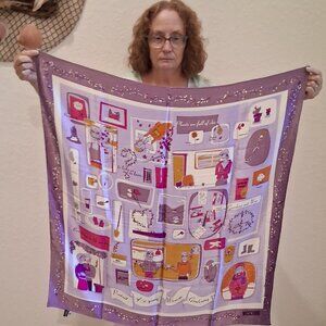 Style the scarf by folding it diagonally to create a triangle, then roll it into a long strip. Wrap it once around your neck, leaving the ends dangling at the front for an effortless, chic look. Fold it into a triangle and place the point in front of your chest. Wrap the two ends around the back of your neck and tie them securely. This looks great over a blazer or a simple white tee and jeans, adding a pop of color and personality. The vibrant colors and whimsical pattern makes it a highly versatile accessory.