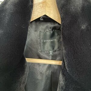 Soft black faux-fur teddy jacket by Dynamite. Plush texture for cozy warmth. Wide lapel collar for a chic look. Cropped hem for modern styling. Easy to layer over outfits.
