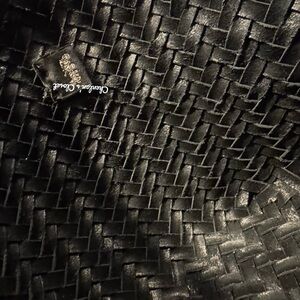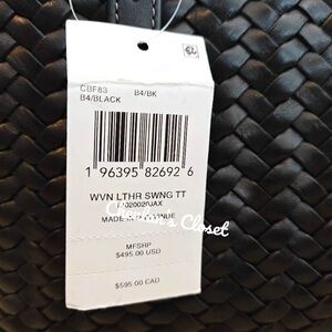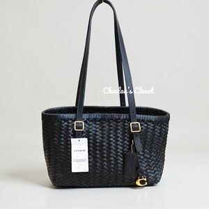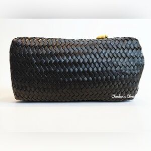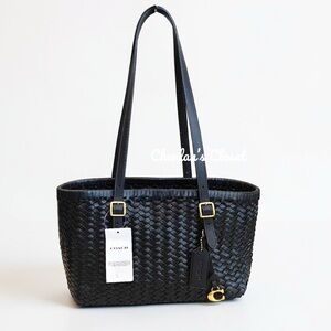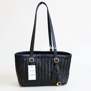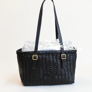 Adorable one! Black woven leather tote with gold detailing. Goes well with everything. Authentic. New with tags