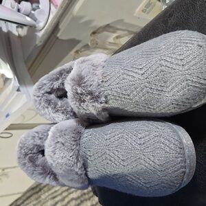 Plush gray women's slip-on slippers with a soft faux-fur collar for added warmth. Textured knit upper provides a comfortable, secure fit. Lightweight cushioned sole delivers daily comfort for around-the-house wear. Easy to slip on and designed for everyday relaxation.