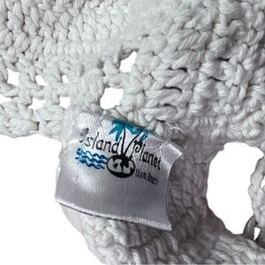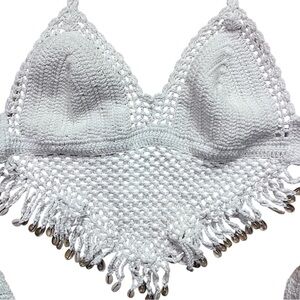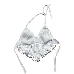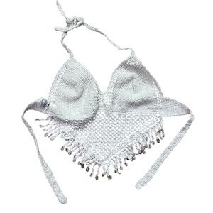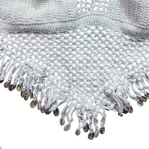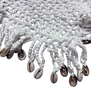 White crochet halter top with fringe detailing and shells. Perfect for summer.