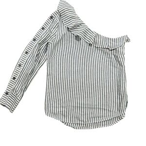 Veronica Beard Luisa Blouse. Asymmetric. Printed stripes decorate a breathable, cotton blended shirt for a versatile, elegant attire. Fit: this style runs small . One-shoulder - Long sleeve - Buttons down long sleeve - Side hidden zip and hook-and-eye clasp closure - Allover stripe print - Ruffle trim - Imported