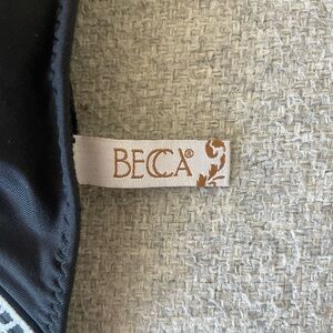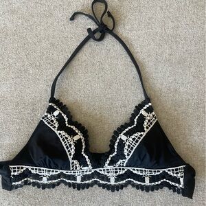 Bikini top in black with contrasting white lace accents. Lightweight fabric with scalloped lace edges. Lined with bra insert padding. Halter & back tie for a soft fit. Feminine and versatile for the beach or going out!