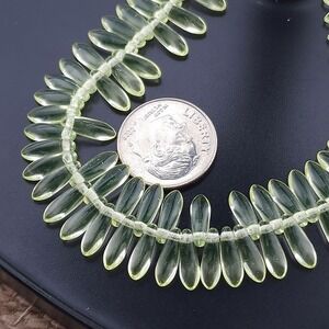 You'll receive 100 beads on a strand. Glass beads made in the Czech Republic. Nice glow in UV light. They are a light yellow-green color. Beads are approx 11x3MM.