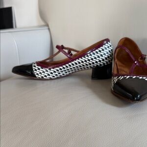 Elegant flats with a striking houndstooth design. Features black and burgundy details. Ideal for chic styling. EUC…worn a few times.