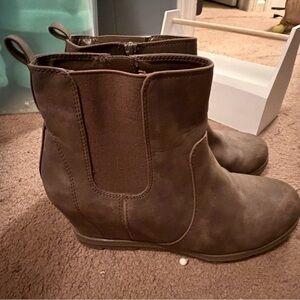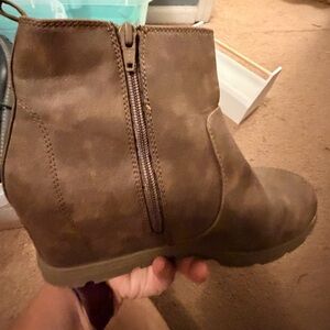 Stylish brown leather wedge ankle boots with side zippers. Perfect for casual wear.