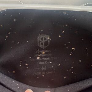 Born Primitive synergy collection - Shimmery black high-waist leggings with matching sports bra (cross back) with gold sparkle. Stretchy, form-fitting fabric for all-day comfort. Versatile black style pairs well with sports bra. Easy care and wearable for day or night.