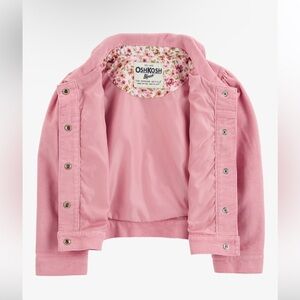 Like new OshKosh B’gosh toddler girl jacket in a soft pink corduroy fabric. Features a button-front closure, chest pockets, and floral lining detail at the collar. Perfect lightweight jacket for fall, spring, or layering in cooler weather.