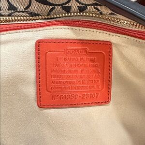 Classic and timeless Coach signature canvas tote featuring black leather trim and gold-tone hardware. The bold red interior gives it the perfect pop of color ✨