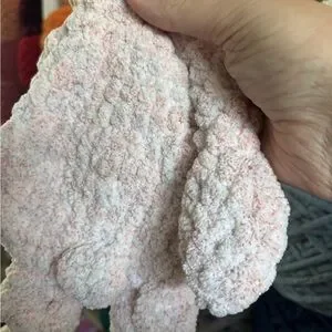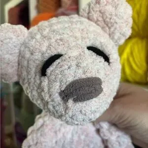 Crochet pink frosting bear knotted lovey. The bear is made with blanket yarn and has embroidered eyes. Safe for age 0+.