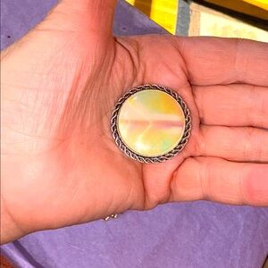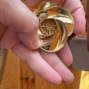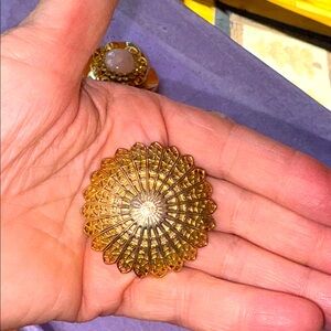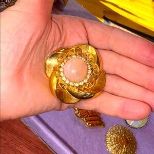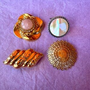 Elegant lot of Estate scarf clips or Hair Clips, including a Nolan Miller-style gold-tone clip with large pink cabochon center, surrounded by clear rhinestones and filigree metal details; an ornate, circular gold-tone starburst or sunburst; a trapezoid shape with bows and bendable wire clips on the back; and lastly a Silvertone metal with mother of pearl or abalone-style center. Very nice vintage condition, please see pics: minor surface scratches, some pitting, could use a cleaning. Only Mark noted is on the one with a pink stone, which has three small dots on the back. Please see last picture.
