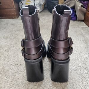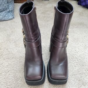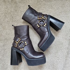 Elevate your shoe game to new heights with the iconic Michael Kors Crosby Moto boot in colorway chocolate. This specific colorway is a deep, rich brown that looks incredibly luxe in person. Featuring a dramatic block heel and a chunky platform, these boots give you major height without sacrificing stability.