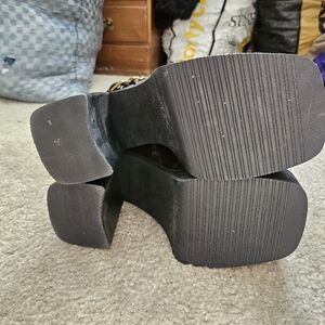 The standout feature is the antique gold-tone moto harness detail with double buckles and O-ring hardware, giving them a perfect grunge chic vibe. The square toe and block heel provide height and stability while serving Bratz doll energy.