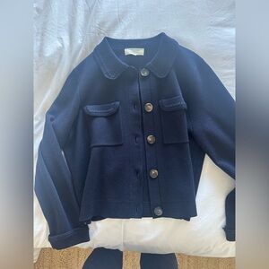 - Crochet finish on collar, pockets and bottom sleeves (some of the extra crochet unraveled on one sleeve but it’s not noticeable / was evenly removed you can see in photo)