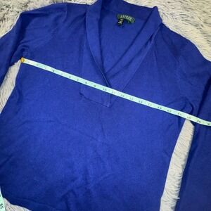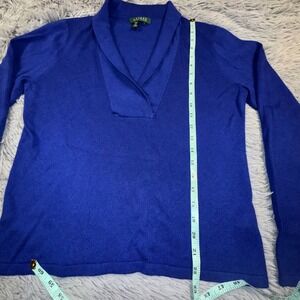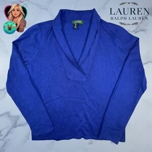 Keywords: LAUREN, Ralph Lauren, women's sweater, blue knit, V-neck, shawl collar, elegant, sophisticated, comfortable, versatile, office wear, casual, pullover, long sleeve
