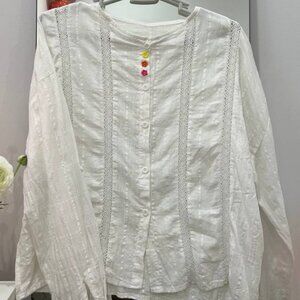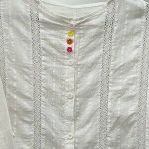 White blouse with lace details and button front. Lightweight and comfortable. Cute colorful buttons detail on the front. Gently used, no major flaws.