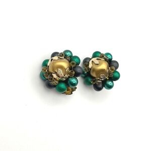 Vintage Japan Green Black Faux Pearl Cluster Clip On Earrings Gold Tone MCM
