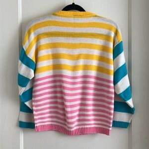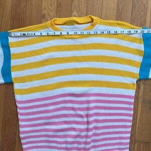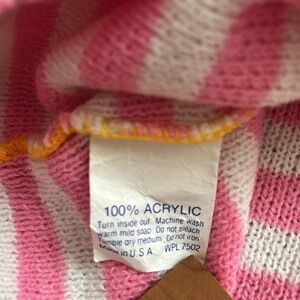 In white and colorful aqua, pink & yellow stripes. Ribbed cuffs and hemline. 100% acrylic with minimal pilling or pulling (one snag shown in photos.) Textured knit makes it easy to “crop” by folding it under. Modeled on XS. Made in USA. A rare, colorful and fun vintage winter piece!