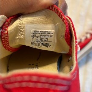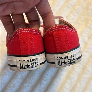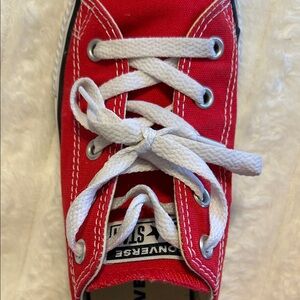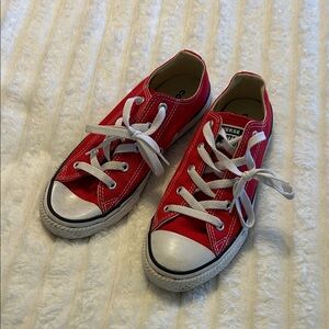 Bright red canvas low-top sneakers for kids. White laces and rubber toe cap. Classic Converse style great for everyday wear.