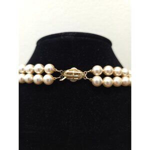 A sophisticated double-strand faux pearl necklace featuring a gold-tone clasp with intricate detailing. This timeless accessory adds elegance to formal attire.