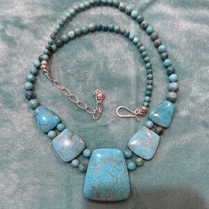 Striking and unmistakably Southwestern, this Jay King / Desert Rose Trading necklace showcases beautiful genuine spiderweb turquoise stones in a vivid robin’s-egg blue with natural coppery-brown matrix throughout. The bold centerpiece is a large polished turquoise slab framed by matching graduated turquoise stones and round beads, creating a dramatic yet balanced design.