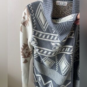 This cardigan features a bold, oversized Aztec or Southwestern-inspired geometric pattern in a color palette of gray, white, and tan. It is designed with an open-front, waterfall-style drape and a large, ribbed shawl collar that extends down the front.