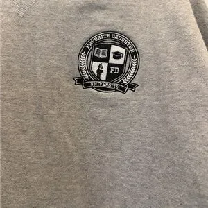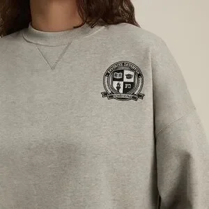 Heather grey crewneck sweatshirt with stitched university-style crest. Casual pullover with soft, cozy feel. Clean, minimal design for everyday wear. Pairs easily with jeans or leggings.