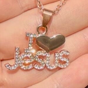 Elegant rose gold tone necklace featuring a sparkling 'I Love Jesus' pendant. Perfect for expressing your faith with style. Warning: EXTREME BLING