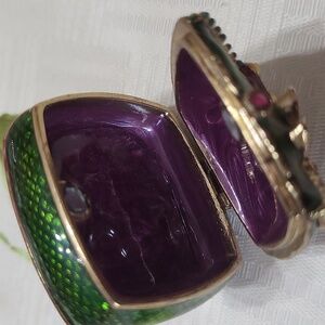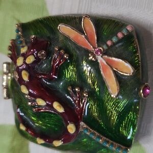 Vibrant enamel trinket box featuring a red lizard and orange dragonfly on a green background. Perfect for small treasures. 1.5" square. Great pre-owned condition.