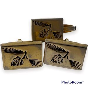 Tie Clip Cuff Links Vintage Pioneer Rustic Pine Cone Outdoors Nature Gold Tone