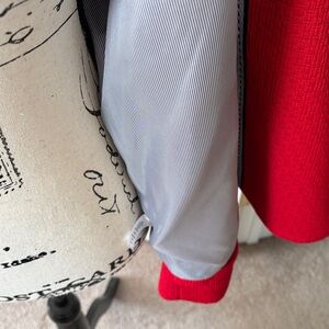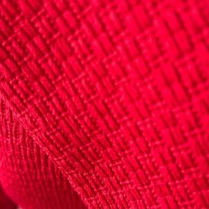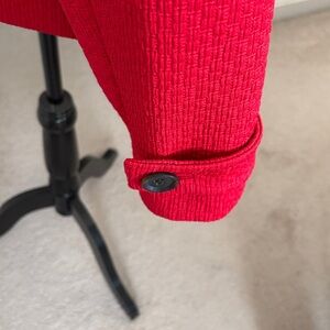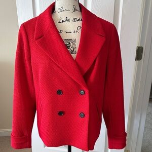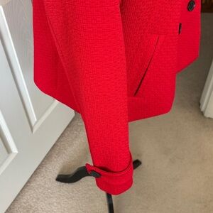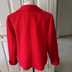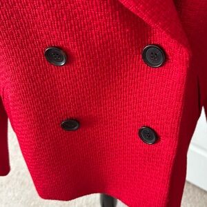 Elegant double-breasted red women's jacket/blazer. Features a tailored notched collar and front pocket details (pockets are NOT functional). Smooth black buttons on the sleeves and the front. Bright red colored textured fabric adds a bold, confident finish. Fully lined.