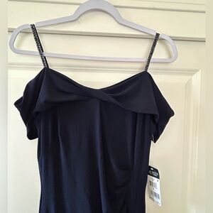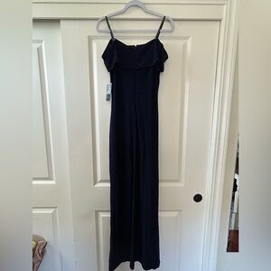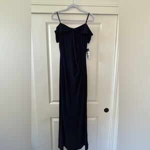 This elegant navy evening gown is perfect for any formal occasion. Its sleek design offers a timeless look that is both sophisticated and stylish. A romantic off-the-shoulder silhouette paired with beaded spaghetti straps brings timeless elegance to this jersey evening gown from Ralph Lauren. Approx. model height is 5'10" and she is wearing a size 2 Approx. 53-1/2" long from center back to hem. Length is based on size 8 and varies 1/4" between sizes Slim fit Off-the-shoulder silhouette Concealed center back zipper with a hook-and-eye closure Beaded spaghetti straps Ruching gathers at the left waist Lined to the knee Shell and lining: polyester/elastane; shoulder straps: polyester Dry clean Imported