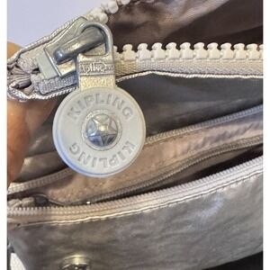 Kipling USA Lynne Convertible Metallic Silver Glow Crossbody Clutch Wristlet Waist Bag Fanny pack. Primarily made out of Nylon. 3 way convertible handbag: Features adjustable, removable strap to turn crossbody into a wristlet, clutch, waist bag/fanny pack. Bag has a main compartment with zipper closer, zip pocket with credit card slots. Lightweight, holds a lot for its small size, super convenient, and perfect for everyday wear to hold all the essentials, or day trips, vacations, etc.