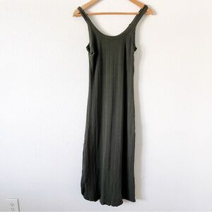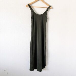 Vitamin A West Organic Olive Green Cut Out Ribbed Resortwear Summer Midi Dress size M. Effortlessly minimal and sustainably made, the Vitamin A West organic ribbed midi dress is a modern wardrobe staple with a relaxed, body-skimming fit. Crafted from a soft, stretchy organic ribbed fabric, this sleeveless midi is perfect for vacation wear, elevated loungewear, casual days, or minimalist styling.