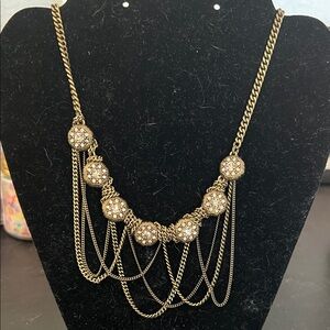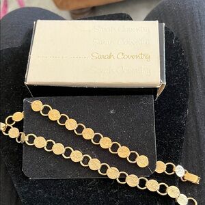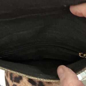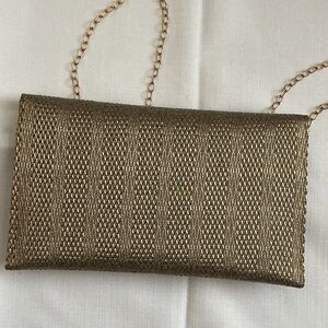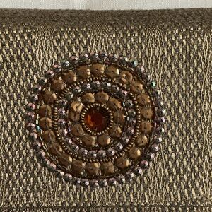 Stylish gold evening clutch with decorative beaded medallion. Features a removable chain strap for hands-free wear. Shimmering gold finish complements formal looks. Has 1 inside pocket