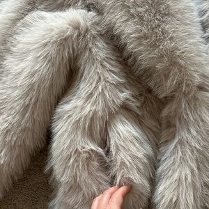 Elegant faux fur coat in a soft cream/light gray color. Perfect for adding a touch of luxury to any outfit.