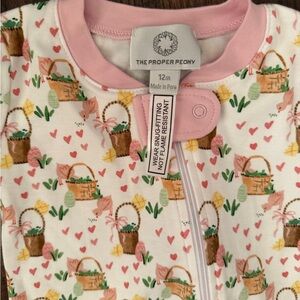 Adorable pink and white zip-up pajama onsie with a charming easter basket print. Perfect for keeping your little one cozy and stylish while sleeping. 12M never worn