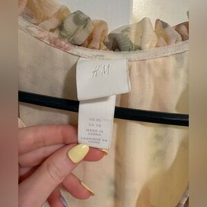 Such a cute dress. From h and m size XL runs true to size. Has v neckline with a tie elastic waist. Cream color with pastel floral design. Excellent condition no signs of wear.