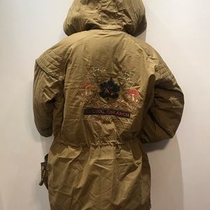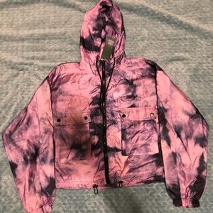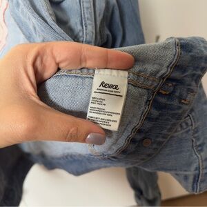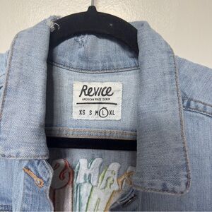 Light blue denim jacket by REVICE. Features a colorful embroidered back patch reading "Dream State." Patch shows rays in red, orange, yellow, green, teal and white with a green eye motif. Casual, statement piece with vibrant accents.