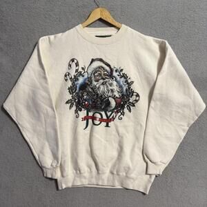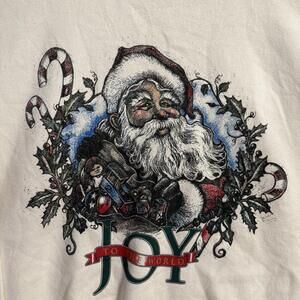 Vintage Snowshoe Thomoson Christmas sweatshirt featuring a detailed Santa Claus graphic with candy canes, holly, and the text “Joy to the World.”