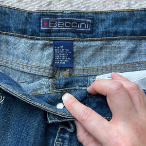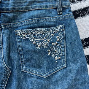 Vintage-style Baccini denim maxi skirt featuring decorative embroidered swirl patterns and silver-tone stud embellishments on both the front and back pockets. Flattering long silhouette with panel construction that creates a subtle flared hem for movement. Medium-wash denim with contrast stitching gives it a classic Y2K / boho western look that pairs well with boots or casual tops.
