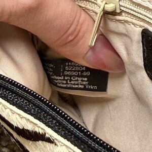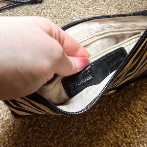 this 2000s wilson leather black/white/brown/silver zebra print calf hair and genuine leather w/faux leather trim and silver buckles and studs is SOO cute!! Obsessed with the details on this.