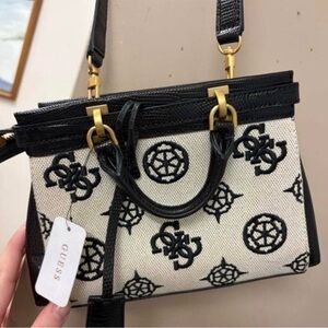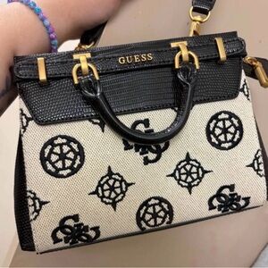 Stylish GUESS satchel with a black and cream pattern. Features elegant gold hardware. Perfect for any occasion.