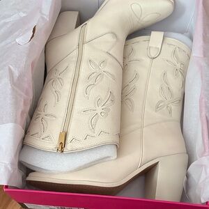 Rich cream textured upper with comfortable sturdy block heel. Classic embroidery, a notched topline and square toe give Western-inspired style to this leather boot. Versatile style that elevates casual and dressy looks. Easy pull-on design for quick styling.
