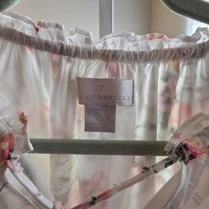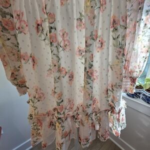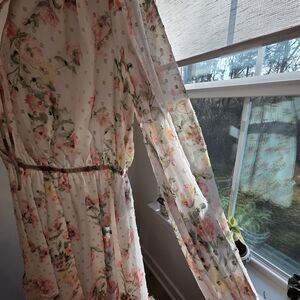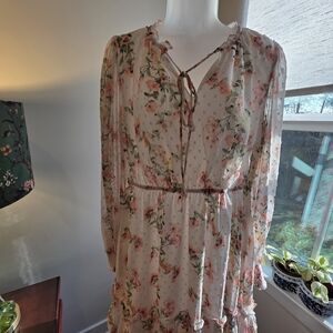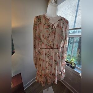 A lightweight, feminine dress with a blush floral print. Sheer long sleeves and a tie-neck detail create a romantic silhouette. Elasticized waist offers a flattering fit. Soft, flowy fabric for all-day comfort.