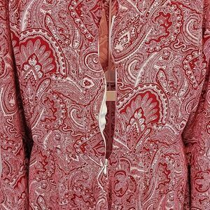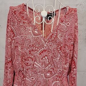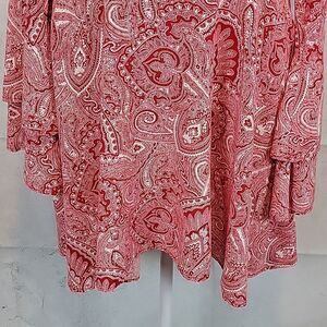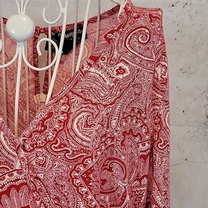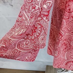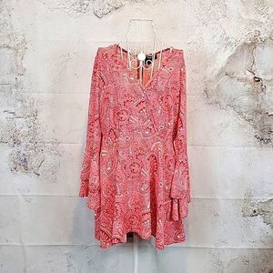 A soft, flowy rayon paisley print shirt dress by Wrangler with tiered ruffle long flutter sleeves, a v-neckline, and a zipper back closure with keyhole accent. Super fun. and in great pre-owned condition.