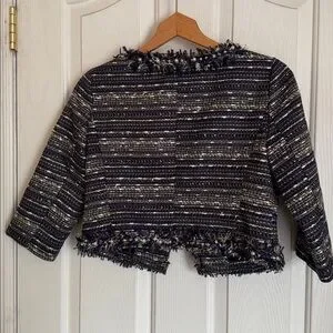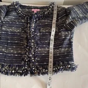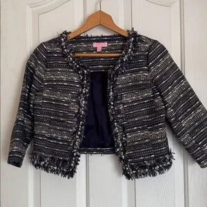 Lilly pulitzer womens tweed boucle cropped blazer, metallic, collarless, hook & eye closure, fringe eith faux pearl trim