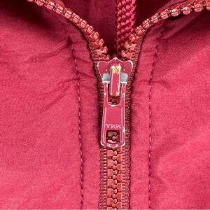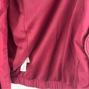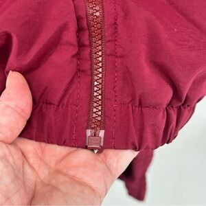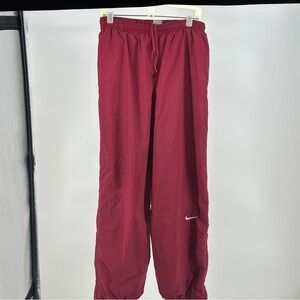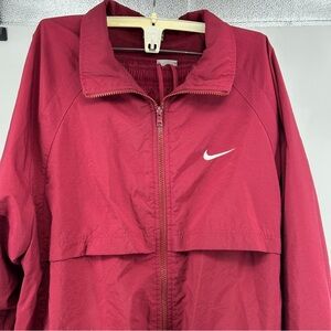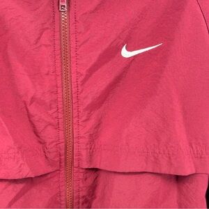 Nike two-piece tracksuit in a rich maroon shade. Zippered windbreaker jacket with elastic hem and cuffs. Matching pants with elastic cuffs for a coordinated look. Embroidered white Nike swoosh on chest and left pant leg.