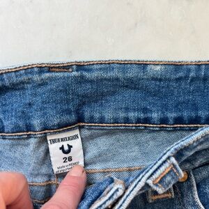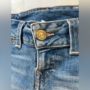 True Religion women's denim shorts in a medium blue wash. Y2K style, low rise. Distressed frayed hem and front grommet slit detail. Gold-tone hardware and contrast stitching. Five-pocket styling with branded pocket rivet. Casual, edgy summer piece.